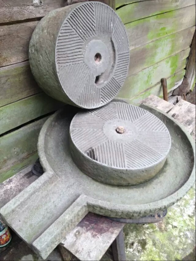 石磨是用于把米、麦、豆等粮食加工成粉、浆的一种机械。开始用人力或畜力,到了晋代,中国劳动人民发明用水作动力的水磨。通常由两个圆石做成。 磨是平面的两层,两层的接合处都有纹理,粮食从上方的孔进入两层中间,沿着纹理向外运移,在滚动过两层面时被磨碎,形成粉末。