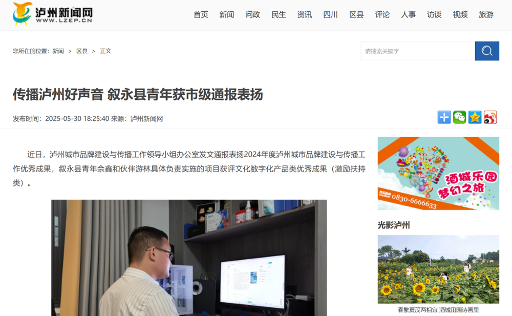 2025年5月30日,多家媒体平台刊发文章,介绍佘鑫获评2024年度泸州城市品牌建设与传播工作优秀成果。