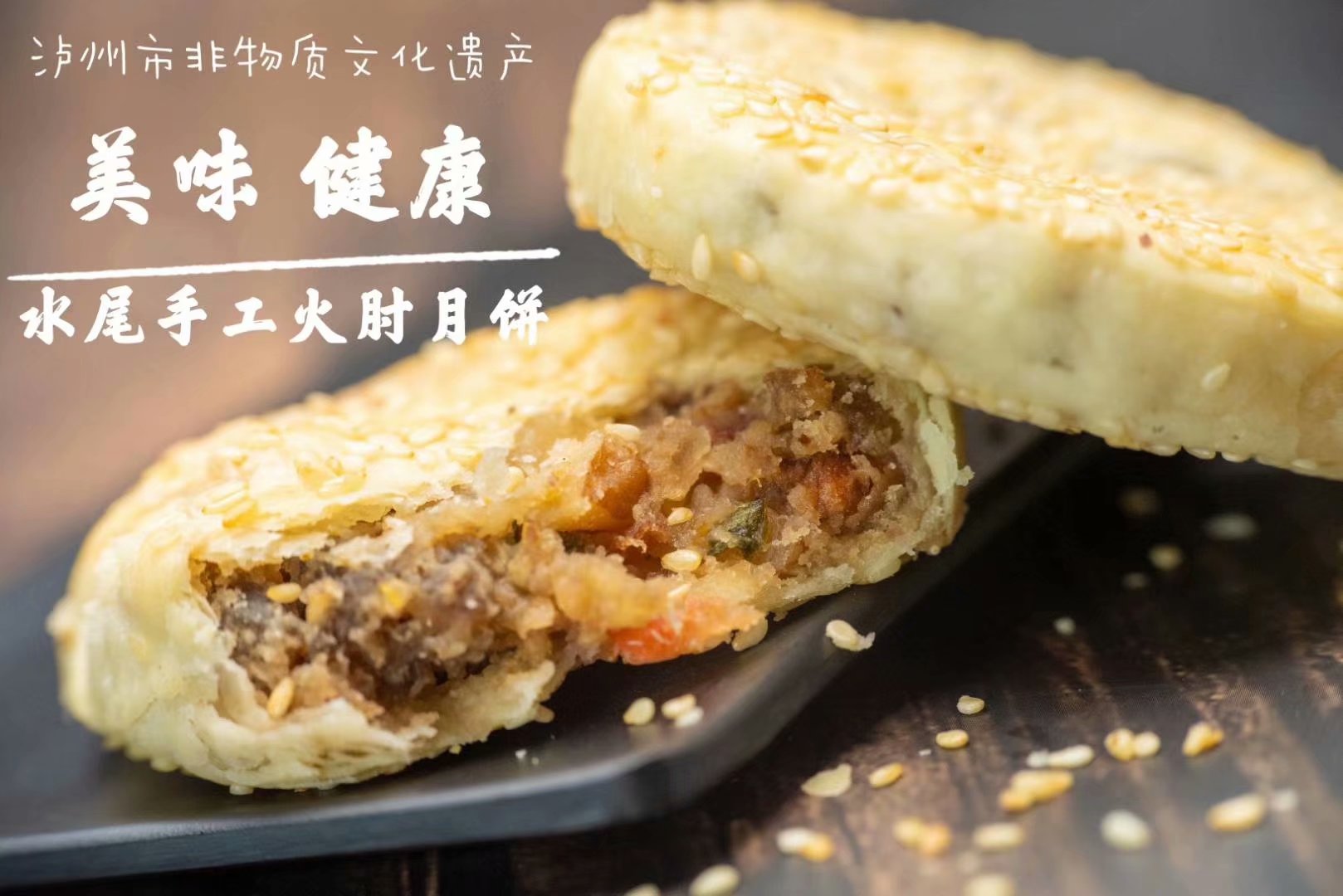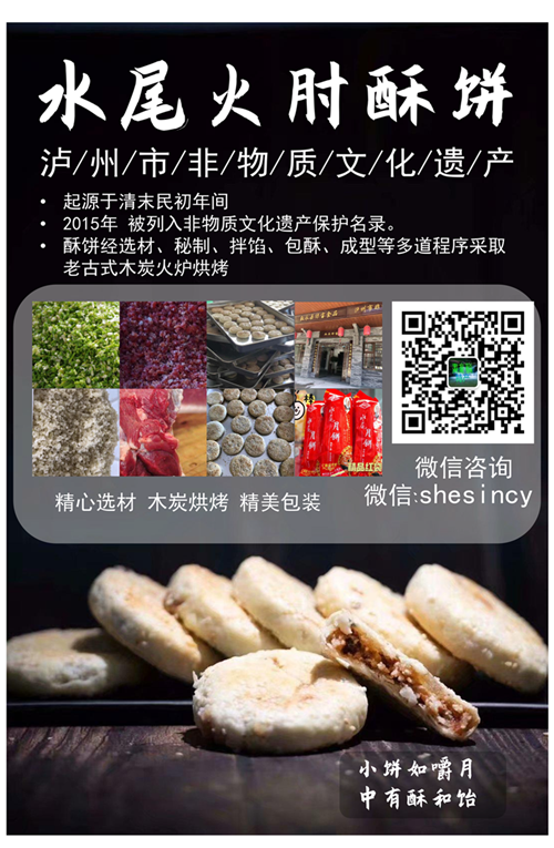 水尾椒盐火肘酥饼,起源于清末民初年间,在叙永茶马古道文化的浸润下历经四代传承,2015年 被列入非物质文化遗产保护名录。第四代传承人范德生,在延续先辈纯手工制作的基础,上,不断改进制作技艺。酥饼经选材、秘制、拌馅、包酥、成型等多道程序采取老古式木炭火炉烘烤,具有口感松酥,油而不腻,绵软化渣等特点,正如苏东坡所述“小饼如嚼月,中有酥和饴”。