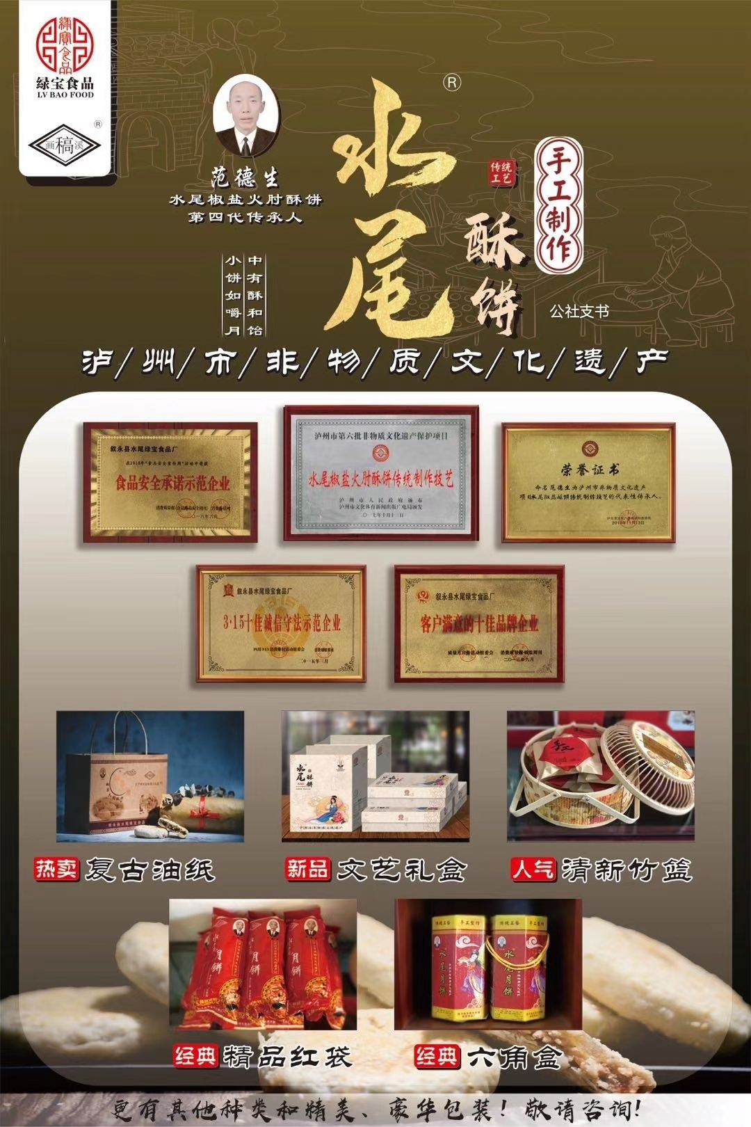 水尾椒盐火肘酥饼,起源于清末民初年间,在叙永茶马古道文化的浸润下历经四代传承,2015年 被列入非物质文化遗产保护名录。第四代传承人范德生,在延续先辈纯手工制作的基础,上,不断改进制作技艺。酥饼经选材、秘制、拌馅、包酥、成型等多道程序采取老古式木炭火炉烘烤,具有口感松酥,油而不腻,绵软化渣等特点,正如苏东坡所述“小饼如嚼月,中有酥和饴”。